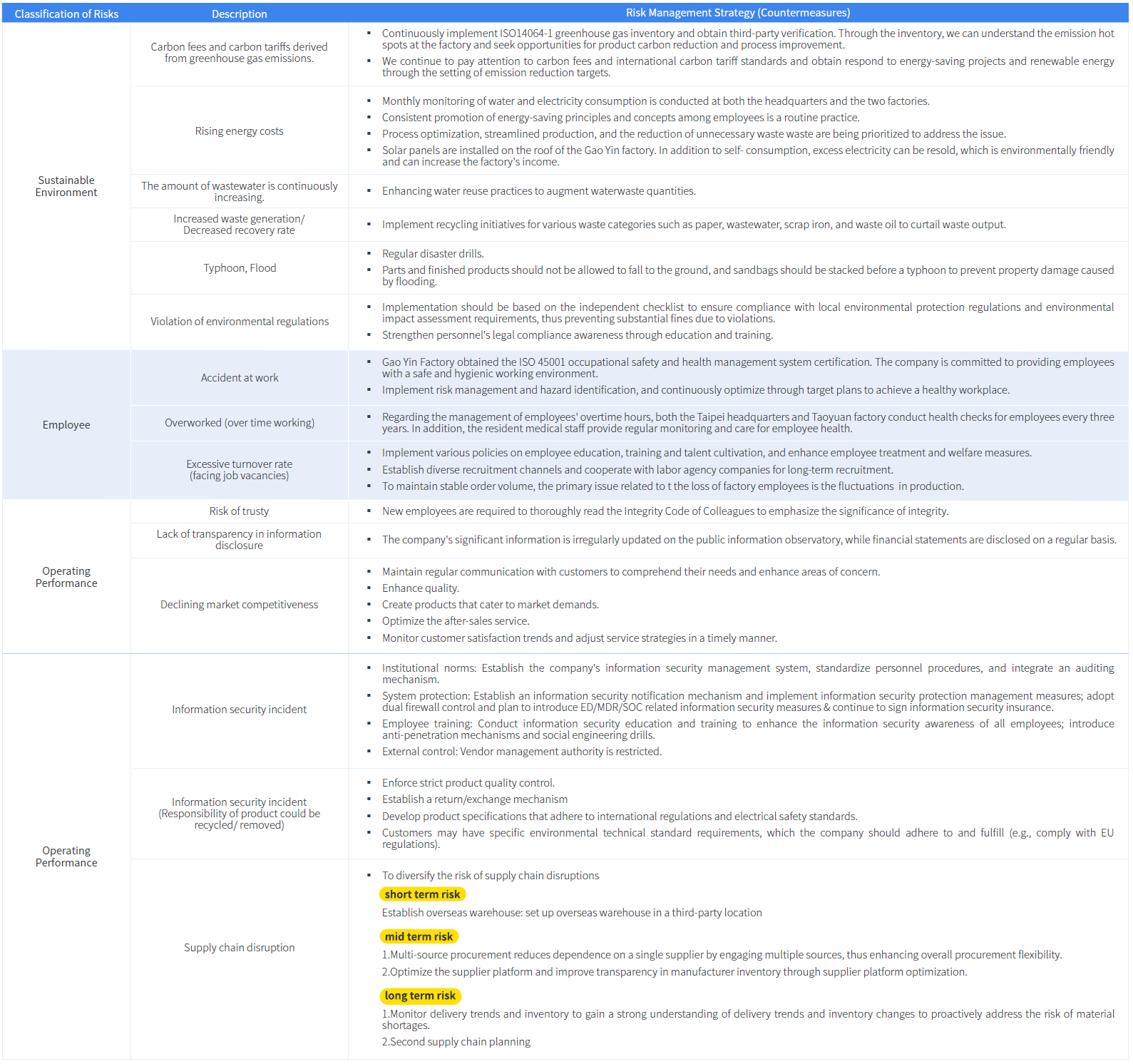 The “ESG Risk Management Policies and Procedures” were endorsed by the board of directors. As part of this initiative, a dedicated risk management team will be established under the umbrella of Sustainable Development Committee. This team will delineate diverse risks in alignment with the company’s overarching operational policies.