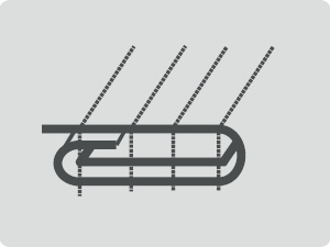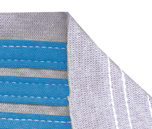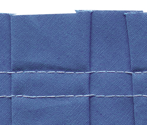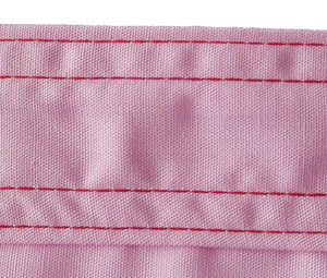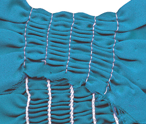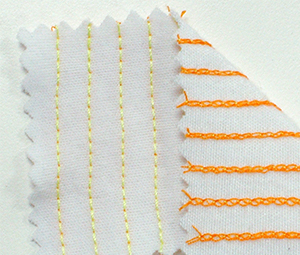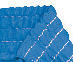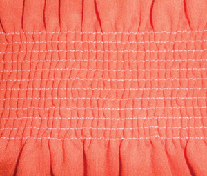 Elastic thread is straight, not looped, which is fixed by needle thread and looper thread. The finish is thinner than VPQ and the shirring becomes flat as it is pulled extensively.