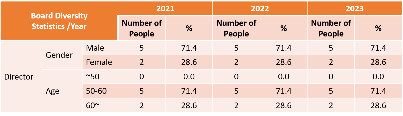 The Company attaches great importance to the independence and diversity of the members of the Board of Directors. For the independence of the Board of Directors, the goal is to have no less than 3 independent directors and no less than one-fifth (inclusive) of the Board of Directors . In 2023, the Board of Directors had 4 independent directors, making up four-sevenths of the seats. Additionally, the goal is to limit the number of directors who are also employees of the Company to no more than one-third of the seats. In 2023, there were two directors who were also employees of the Company, consisting one-sevenths of the seats. There are three directors who are spouses or relatives within second degree of kinship, comprising three out of seven of the seats.