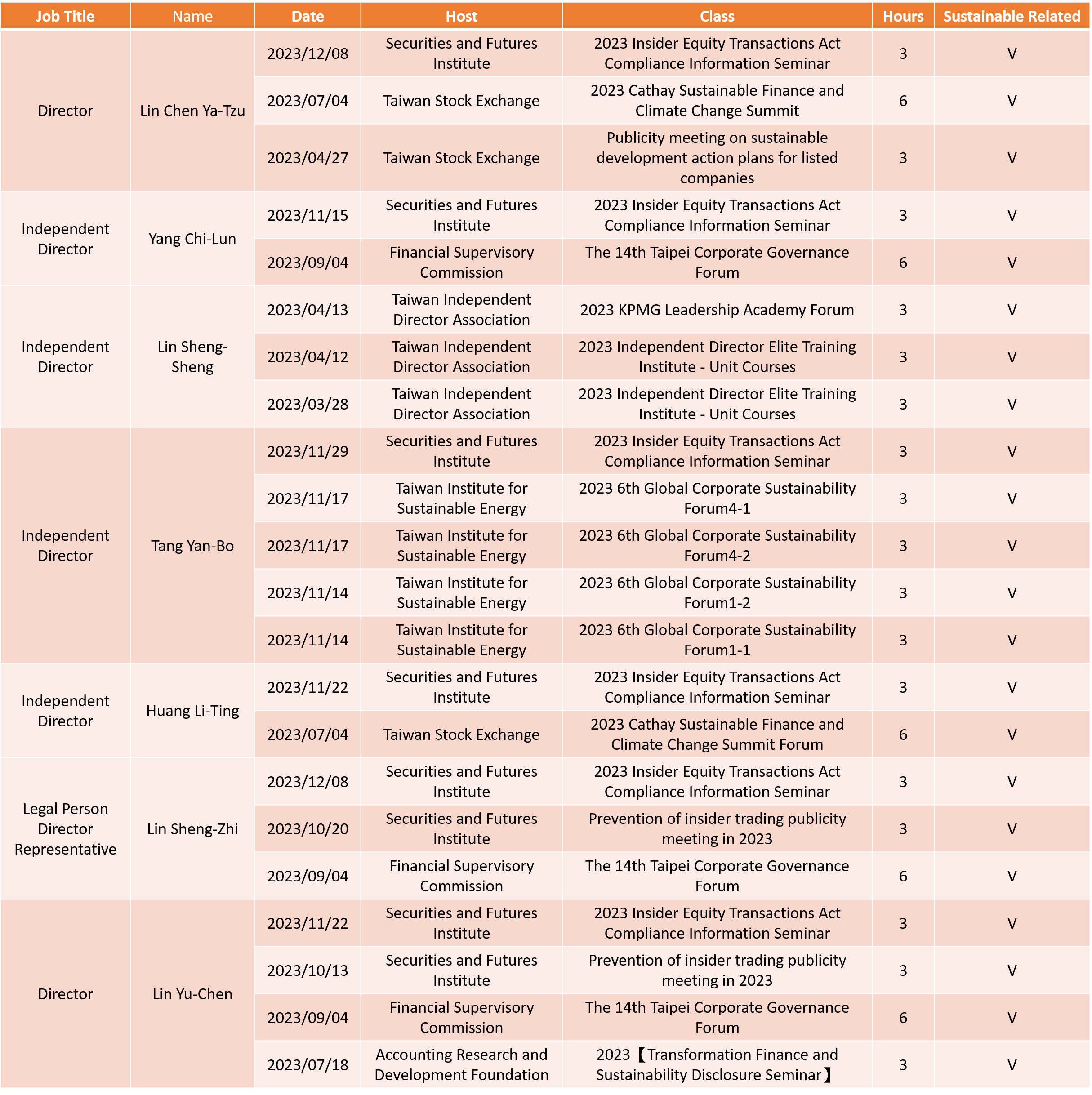 To enhance the ethical standards of conduct among our internal staff and to uphold a culture of integrity, we have established not only a “Code of Ethical Conduct” and “Guidelines for Ethical Operations and Behavior,” but also a comprehensive framework encompassing: conflicts of interest prevention, avoidance of personal gain opportunities, confidentiality responsibilities, equitable transactions, safeguarding and appropriate use of corporate assets, adherence to legal regulations, encouragement of reporting unlawful or unethical actions, and disciplinary measures, among others. All these pertinent guidelines have been endorsed by the Board of Directors, put into practice, shared with independent directors, reported at shareholders’ meetings, and communicated to employees. Furthermore, anti-corruption policies have been promoted. Concurrently, we actively advocate for directors’ adherence to the ” Corporate Governance Practices for Listed and OTC Companies.” Throughout their tenures, directors are encouraged to commit a minimum of 6 hours annually to courses on finance, risk management, business, commerce, legal matters, accounting, sustainability, and corporate governance, as well as internal control system and financial reporting responsibilities. We consistently arrange courses for both directors and employees, covering themes like corporate governance, legal compliance, risk management, prevention, money laundering prevention and counter I terrorism. By continuing to provide these courses, we reinforce our commitment to fostering strong corporate governance, legal adherence, risk management, and proactive measures against money laundering and the fight against terrorism.