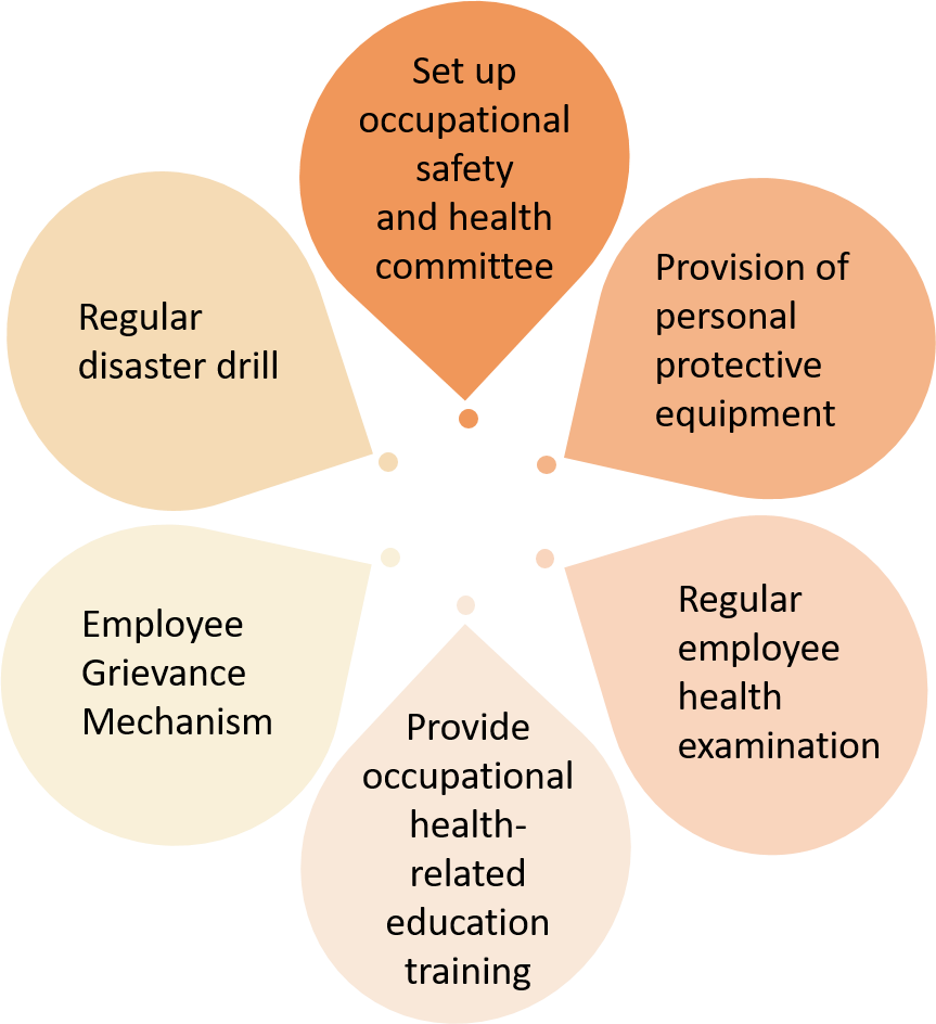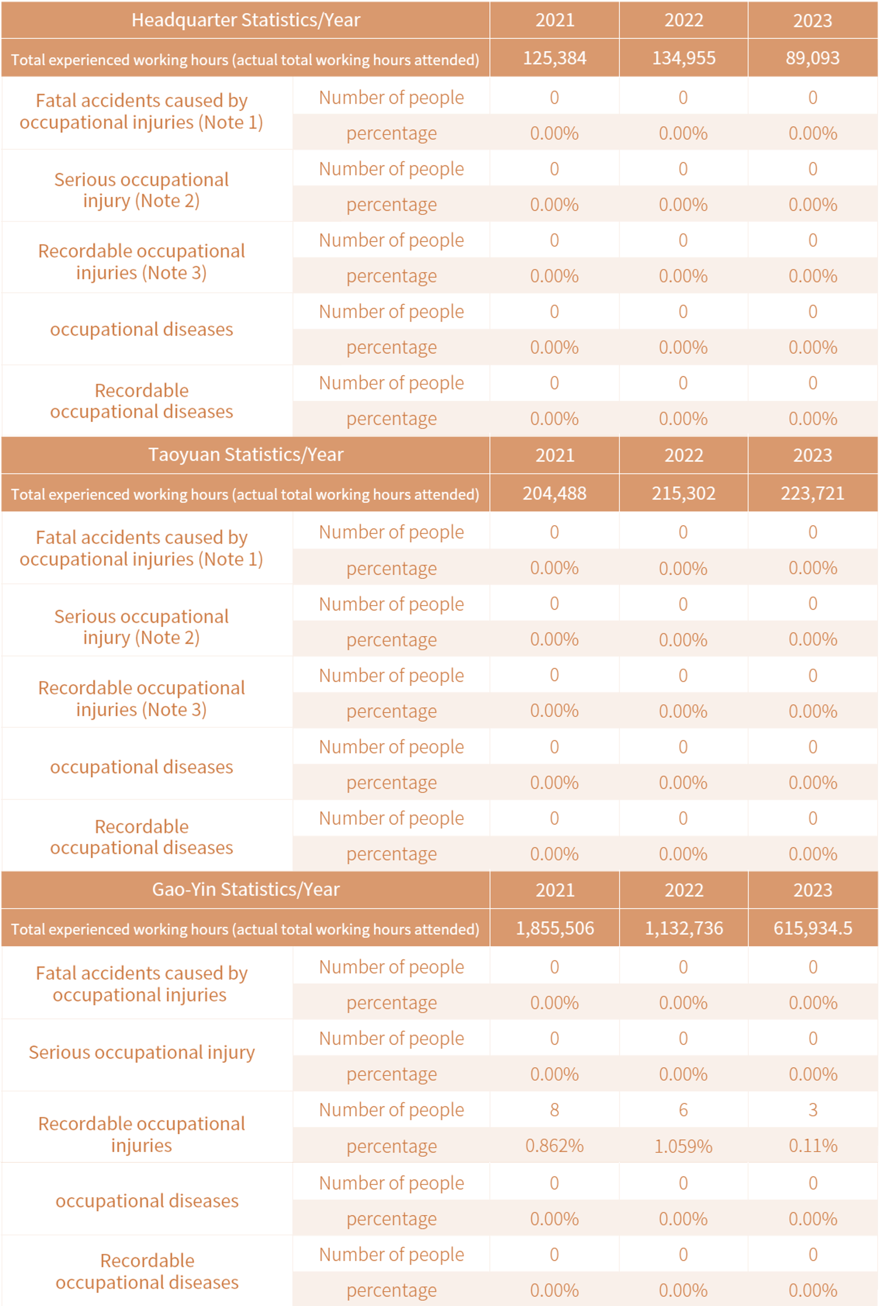 Our company, Gao-yin Factory, has implemented the ISO 45001 Occupational Health and Safety Management System and established occupational health and safety management regulations. Our safety and health policy is based on the principles of “respect for the value of life,” “commitment to safety discipline,” and “prevention of workplace accidents,” with the goal of complying with government occupational safety and health laws and fulfilling our corporate social responsibility. We are committed to providing customers with high-quality and safe products that meet relevant laws, regulations, and standards, while also preventing workplace accidents. Through health promotion, we strive to create a friendly workplace and fulfill our social responsibility as a company.